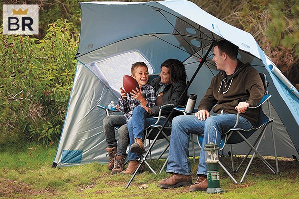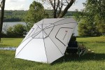 This super-brella offers complete shelter from the sun, featuring large side flaps with zippered windows for extra airflow.